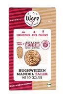 Buchweizen Vollkornmehl*(33%), Honig*, Palmöl*, Reissirup-Schokolade* (10%) (Kakao*: 67% mindestens) (Kakaomasse*, Reissirup-Pulver* [Reis*, fermentiert], Kakaobutter*), MANDELN* (10%), Weinstein-Backpulver* (Maisstärke*, Säuerungsmittel: Kaliumtartrat, Backtriebmittel: Natriumbicarbonat), Verdickungsmittel: Guarkernmehl*, Meersalz;| Energie | Fett | gesättigte Fettsäuren | Kohlenhydrate | Zucker | Ballaststoffe | Eiweiss | Salz |