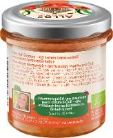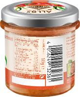 Tomaten* (50%), Sonnenblumenkerne*, rote Paprika* (10%), Tomatenmark*( 8%), Agavendicksaft*, natives Olivenöl* extra, Kirschtomaten*( 4%), Kartoffelstärke*, Meersalz, Zitronensaftkonzentrat*, Chilipulver* (0,5%), Basilikum*, Oregano*, Knoblauch*, Paprikapulver*, Verdickungsmittel:Johannisbrotkernmehl*.| Energie | Fett | gesättigte Fettsäuren | Kohlenhydrate | Zucker | Ballaststoffe | Eiweiss | Salz |