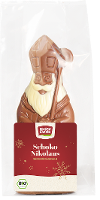 Traditioneller Nikolaus mit echter Bischofsmütze und Stab:Schokoladen-Hohlfigur aus Bio-Vollmilch-Schokolade, dezent mit weisser Schokolade geschminkt